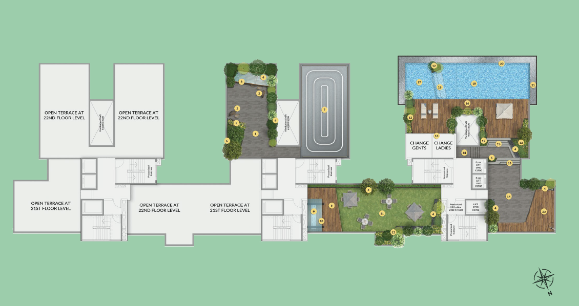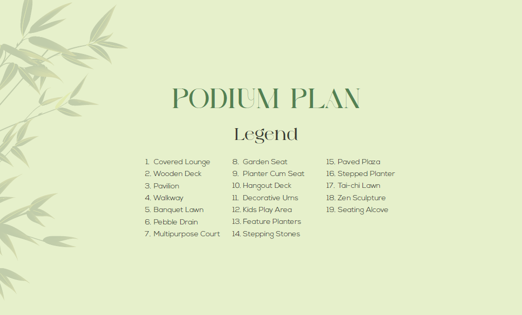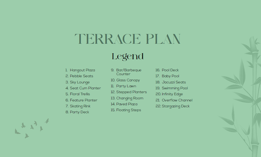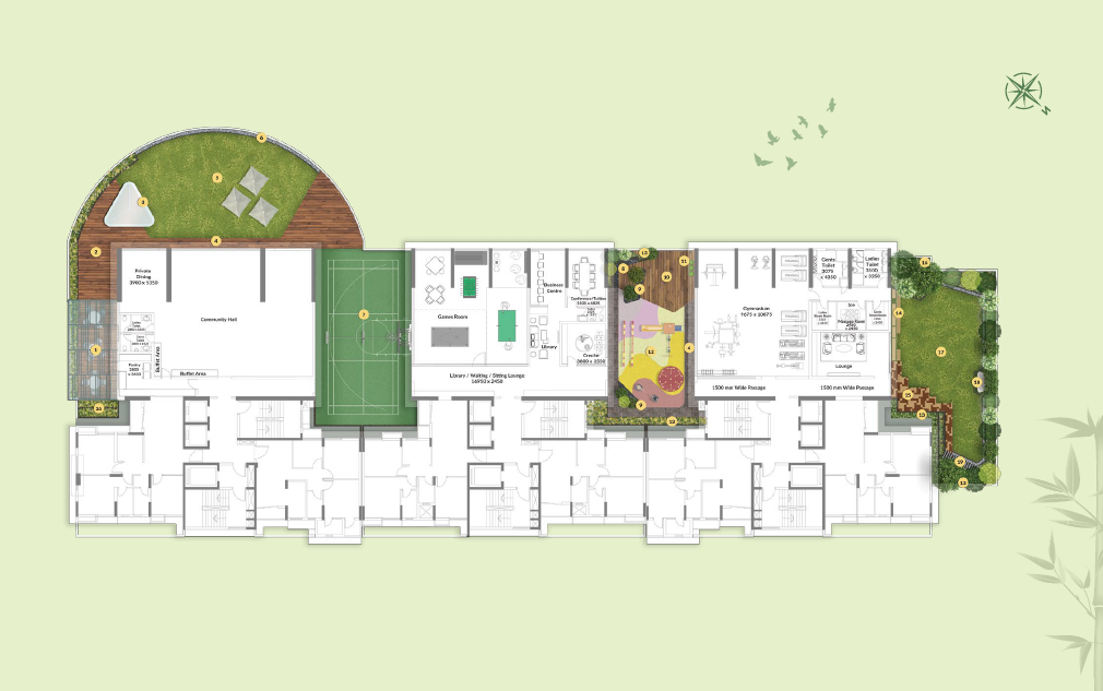 Gymnasium & Spa Infinity Pool Indoor Games Room Zen Garden Multipurpose Court Baby Pool Banquet Hall/ Lawn Bbq Counter Star Gazing Point Senior's Sanctuary Creche AV Room Skating Rink Co- Working Business Centre Kids Play Garden Fragrance Garden