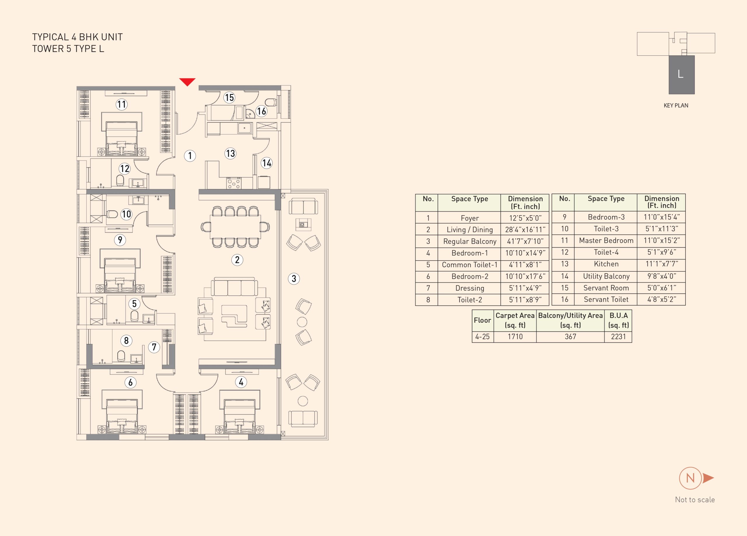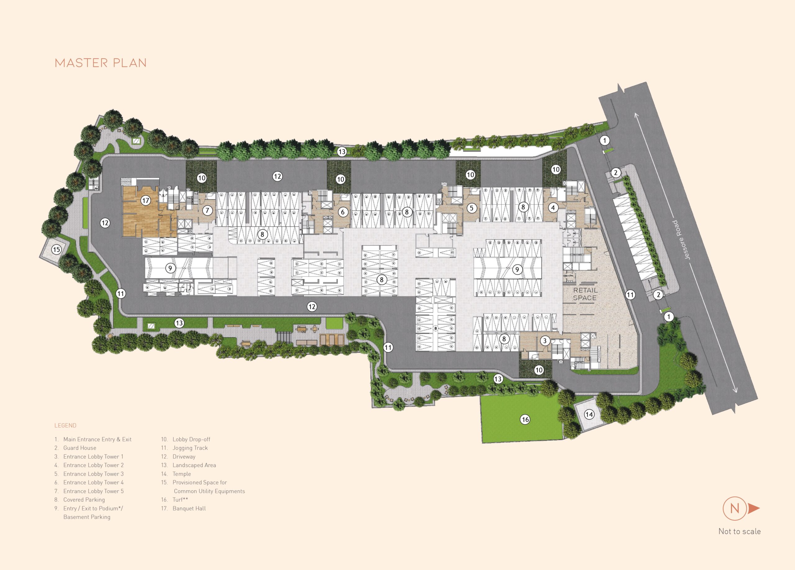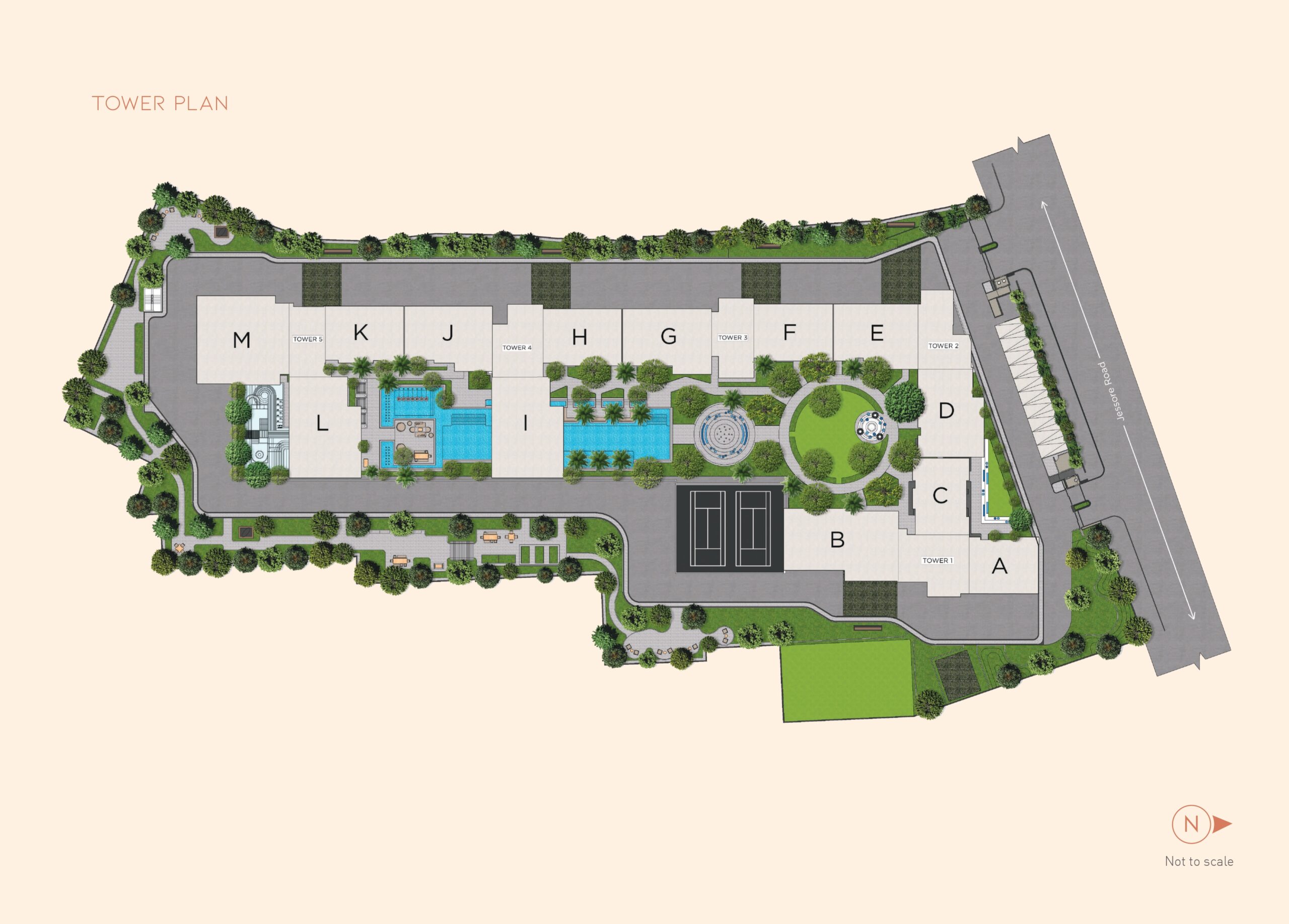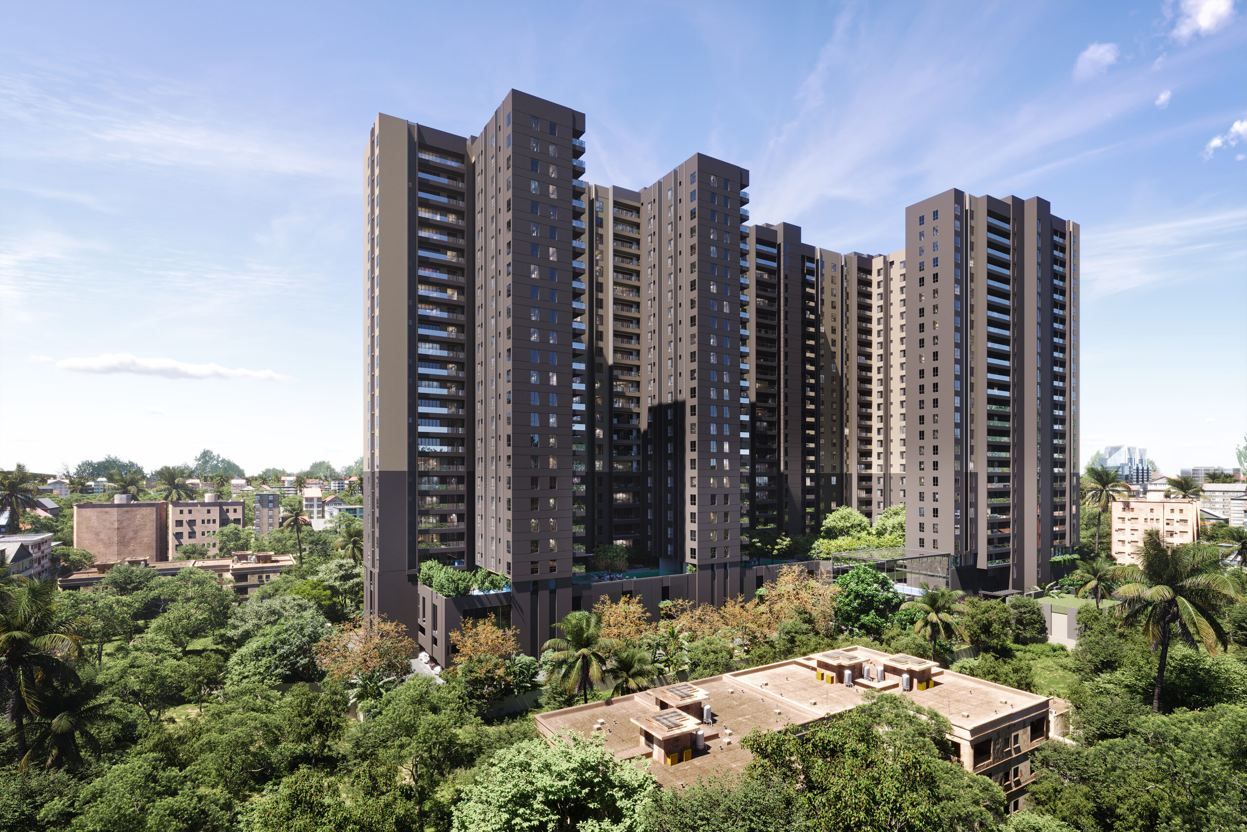 The project features a 3rd-floor podium connecting all five towers with various amenities like a gym, swimming pool, and landscaped areas